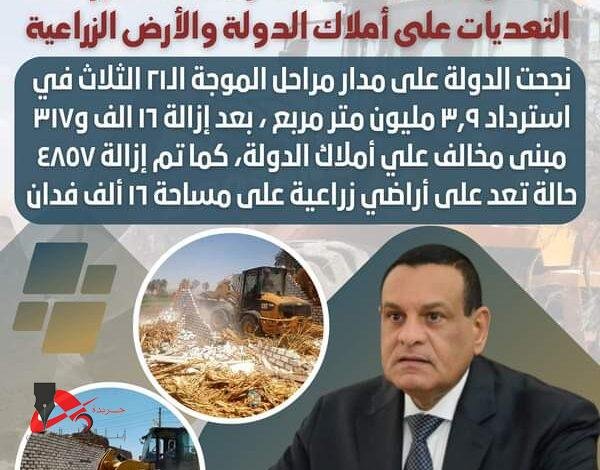 أعلن اللواء هشام آمنة وزير التنمية المحلية، عن انتهاء حملات الموجة الــ 21 لإزالة التعديات علي أملاك الدولة والأراضي الزراعية والتي جري تنفيذها خلال الفترة من 19 أبريل الماضي وحتى 28 يوليو الجاري، تحت إشراف اللجنة العليا لاستراد أراضي الدولة برئاسة اللواء حسن عبد الشافي مستشار رئاسة الجمهورية، وضمن الحملات المكثفة التي تنفذها الدولة للحفاظ على حقوقها واسترداد حق الشعب من خلال إزالة كافة صور التعديات، وذلك في إطار جهود أجهزة الدولة المختلفة لتنفيذ توجيهات القيادة السياسية لاسترداد أراضي وأملاك الدولة والتصدي بكل قوة وحزم لكافة أشكال التعديات والحفاظ على حقوق الأجيال القادمة وتطبيق القانون ومواجهة ظاهرة التعدي عليها بمنع البناء المخالف.