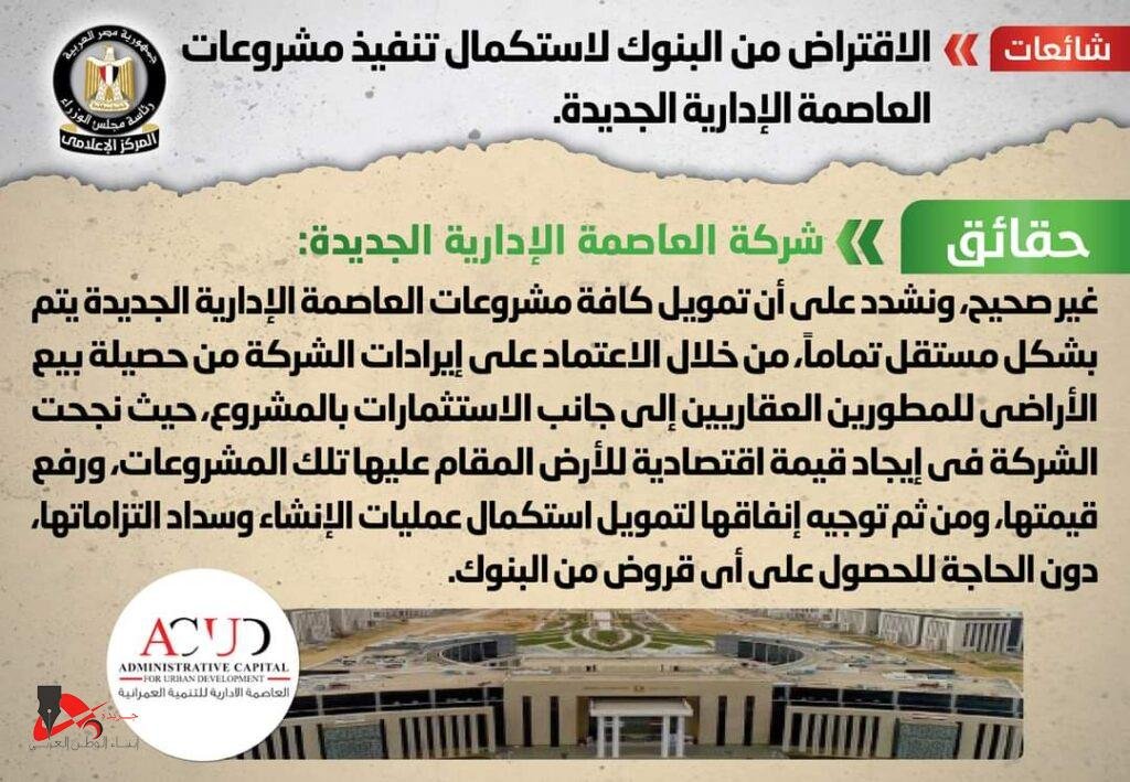 تواصل المركز الإعلامي لمجلس الوزراء مع شركة العاصمة الإدارية الجديدة، والتي نفت تلك الأنباء، مُؤكدةً أنه لا صحة للاقتراض من البنوك لاستكمال تنفيذ مشروعات العاصمة الإدارية الجديدة، مٌشددةً على أن تمويل كافة مشروعات العاصمة الإدارية الجديدة يتم بشكل مستقل تماماً، من خلال الاعتماد على إيرادات الشركة من حصيلة بيع الأراضي للمطورين العقاريين إلى جانب الاستثمارات بالمشروع، حيث نجحت الشركة في إيجاد قيمة اقتصادية للأرض المقام عليها تلك المشروعات، ورفع قيمتها، ومن ثم توجيه إنفاقها لتمويل استكمال عمليات الإنشاء وسداد التزاماتها، دون الحاجة للحصول على أي قروض من البنوك.