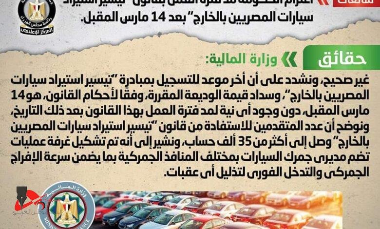 تداولت بعض المواقع الإلكترونية وصفحات التواصل الاجتماعي أنباء حول اعتزام الحكومة مد فترة العمل بقانون “تيسير استيراد سيارات المصريين بالخارج” بعد 14 مارس المقبل، وقد قام المركز الإعلامي لمجلس الوزراء بالتواصل مع وزارة المالية، والتي نفت تلك الأنباء