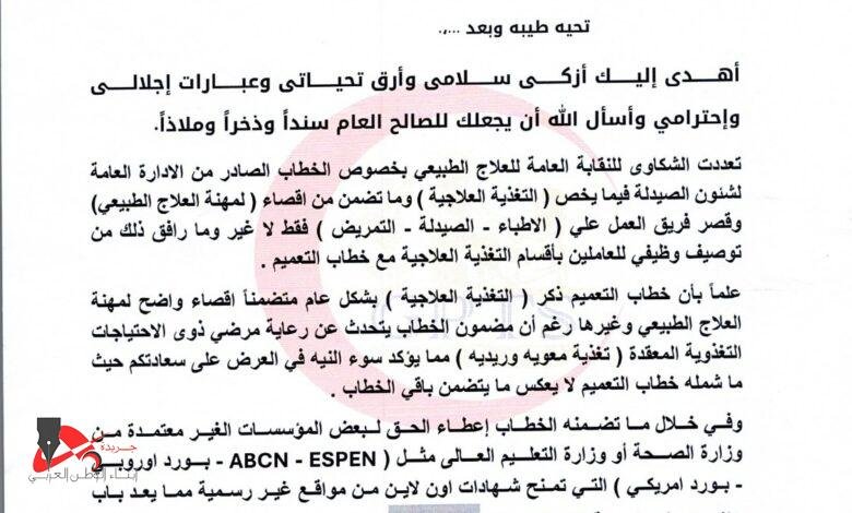 أعربت النقابة في خطابها عن تحفظها الشديد على ما تضمنه المنشور من استبعاد واضح لمهنة العلاج الطبيعي من فريق العمل المختص بالتغذية العلاجية، وقصرها فقط على “الأطباء، الصيادلة، والتمريض”، معتبرة أن هذا التوجه يتجاهل الدور المحوري والأصيل الذي يقوم به ممارسو العلاج الطبيعي في هذا المجال وفقا للقانون واللوائح المنظمة.