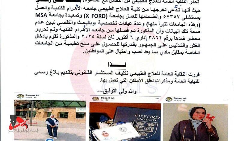 أكدت النقابة أنها لن تتهاون مع أي محاولات لانتحال الصفة أو الإساءة لمهنة العلاج الطبيعي، مشددة على استمرارها في رصد أي مخالفات مماثلة واتخاذ الإجراءات القانونية حيالها.