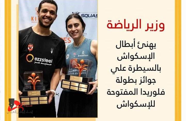 وزير الرياضة يهنئ أبطال الإسكواش بالسيطرة علي جوائز بطولة فلوريدا المفتوحة للإسكواش